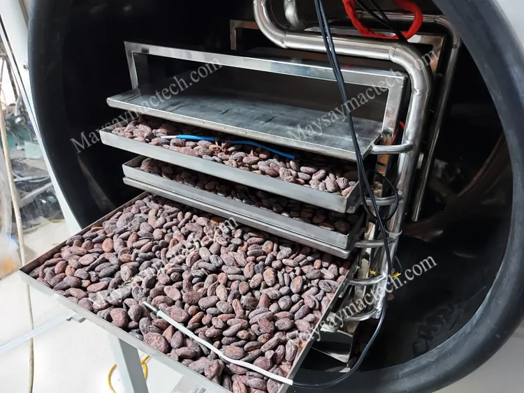 Sử dụng máy sấy thăng hoa có lẽ là cách sấy duy nhất với sản phẩm hoa quả chín này để đảm bảo khô giòn mà không làm chảy tinh dầu, tức là khi khô hoàn toàn thì bạn cầm trên tay sẽ không có bất cứ thứ gì dính trên tay, có thể bóp vỡ vụn dễ dàng miếng bơ khô. Sấy thăng hoa là sấy khô sản phẩm khi đã được đông đá ở nhiệt độ âm sâu, khoảng -30oc, trong buồng sấy được hút chân không để nước đá hóa hơi nhanh chóng. Sau khi quả bơ chín đã khô, hình thức sản phẩm gần như không có gì thay đổi so với ban đầu. Miếng bơ chín đã khô có thể bóp vỡ vụn dễ dàng, do vậy cách làm bột bơ chín như này sẽ cho chất lượng bột rất cao, mịn, màu đẹp, độ ẩm 0-3%.